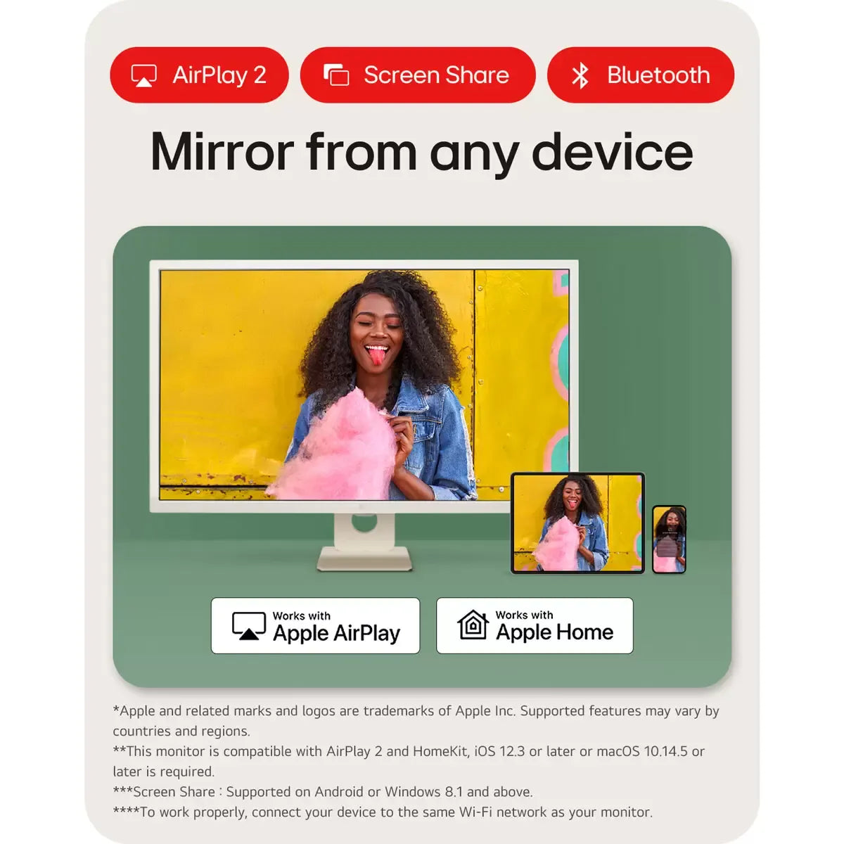 - Mirror Straight From Your Devices – Easily share content from your smart device to your monitor with AirPlay2 or Screen Share.