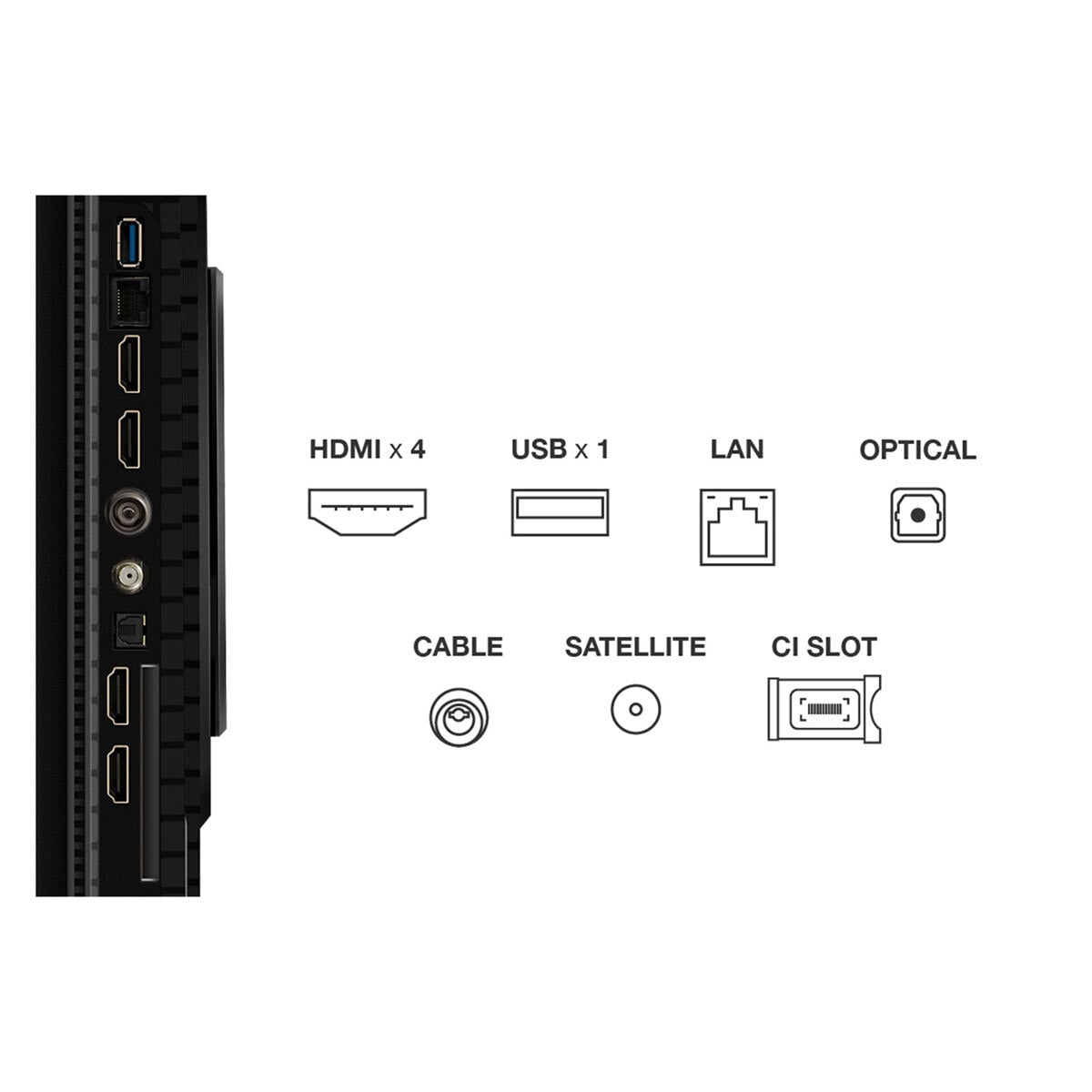 | Connectivity | 4 x HDMI (2.1)(eArc HDMI 4) 1 x USB 1 x CI Slot 1 x RF In 1 x SPDIF (Optical Digital Audio Out) 1 x Headphone Out |